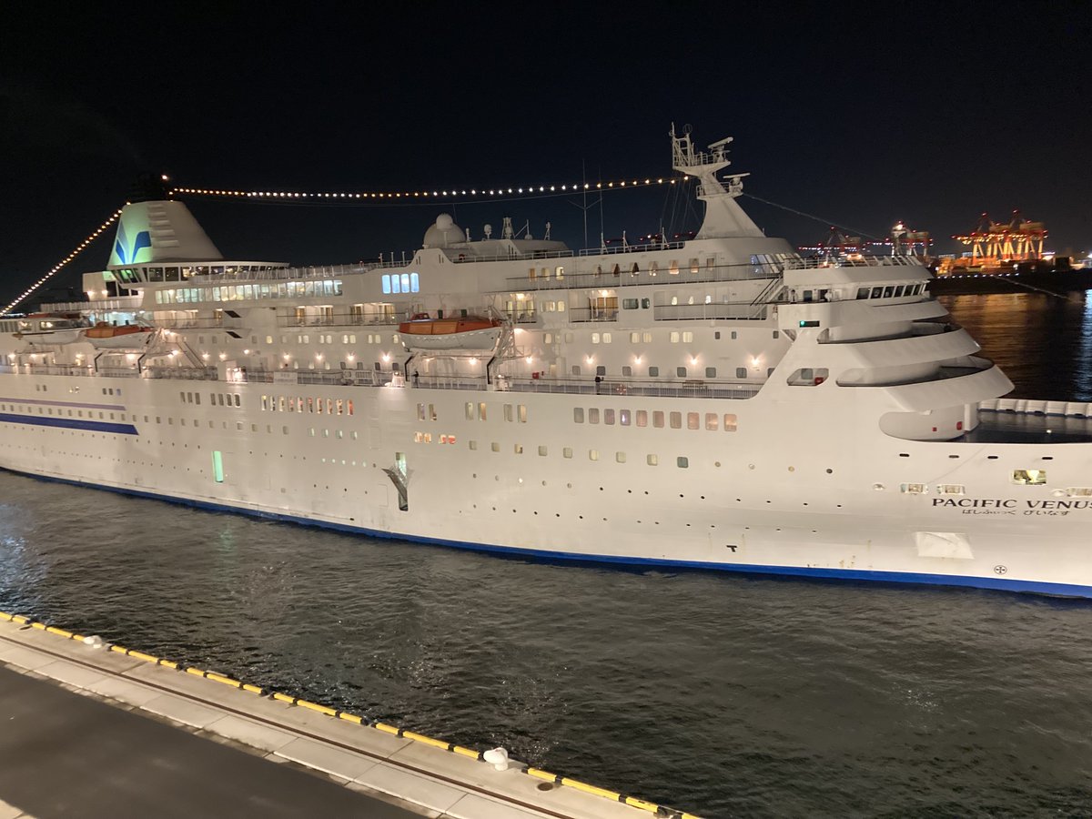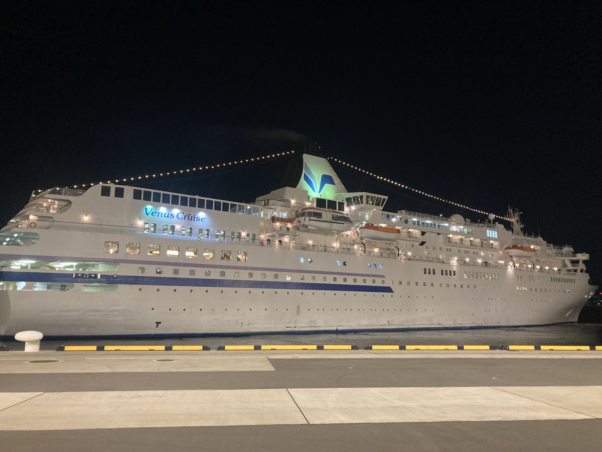 明日出港予定のぱしふぃっくびいなすが入港しました❗️🚢😆🌖 昼間も良いですが、夜の船も趣がありますね💕気温が低くとても寒くなってきておりますので、明日ご来館される皆様は温かくしてお越しくださいませ☺️