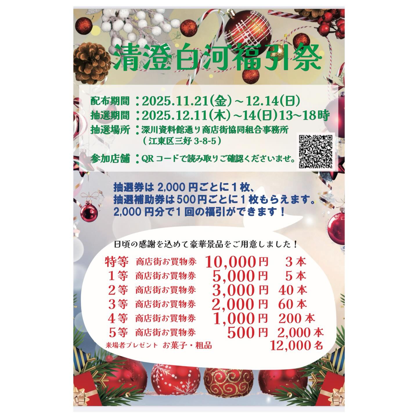 清澄白河深川資料館通り商店街主催、清澄白河福引祭、明日11月21日(金)〜12月14日(日)まで、2,000円で福引抽選券、500円で補助券を画像記載店舗にて配布しております!12月11日(木)〜14..