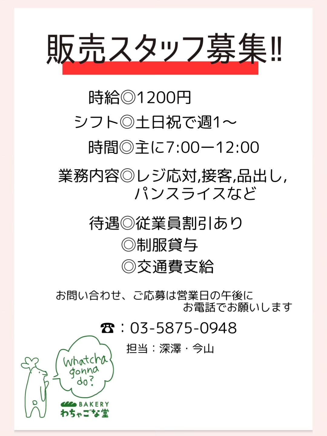 販売スタッフ募集‼️土日祝日の販売スタッフに空きが出たので募集します。基本的には午前中のシフトですが、日によって午後でも働けるとより助かります。販売経験者でも未経験でも大丈夫です◎パンと接客が好きな方..