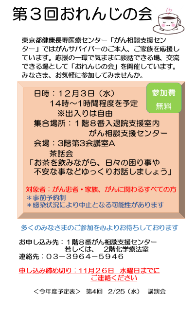 おれんじの会を開催します。 おれんじの会は、患者様ご本人、ご家族、関わる方どなたでも気ままに談話・交流できる場です。出入りは自由ですのでお気軽にご参加ください。 日時:12月3日(水)14時~1時間程度を予定 詳細はこちら https://tmghig.jp/hospital/info/archives/016835/… #がんサバイバー #がん相談