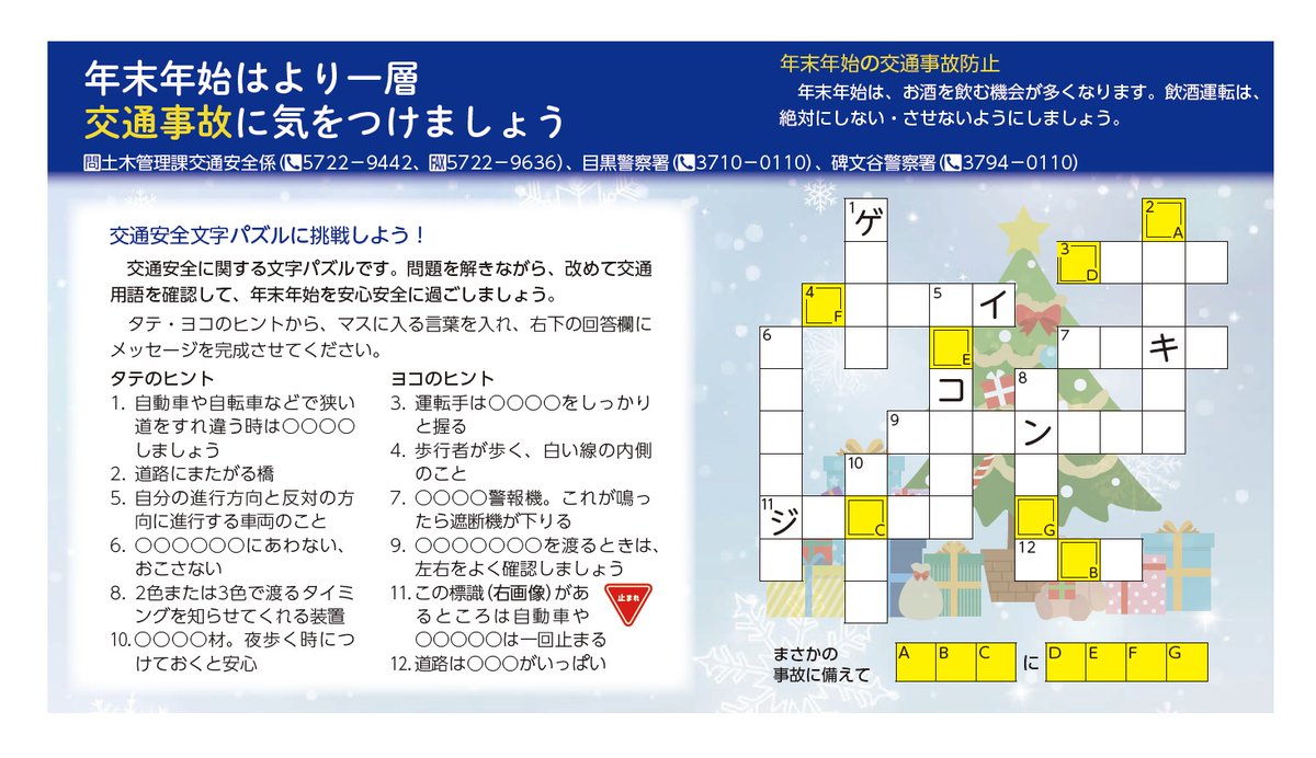 🚨今日は #交通安全日 です!🚨 #めぐろ区報 12/1号で、交通安全に関する文字パズルにチャレンジしてみましょう! 問題を解きながら、改めて交通用語の確認をしてみてはいかがでしょうか。 ※問題の答えは12/1号の6面をご確認ください🧐