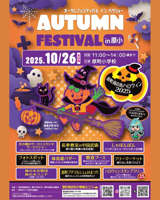 今年も内容盛り沢山で開催します!!仮装してぜひ遊びに来てください♪日時:10月26日(日)11時〜14時まで場所:原町小学校校庭、体育館お子様から大人まで楽しんでいただけるよう皆さまのご来場お待ちして..