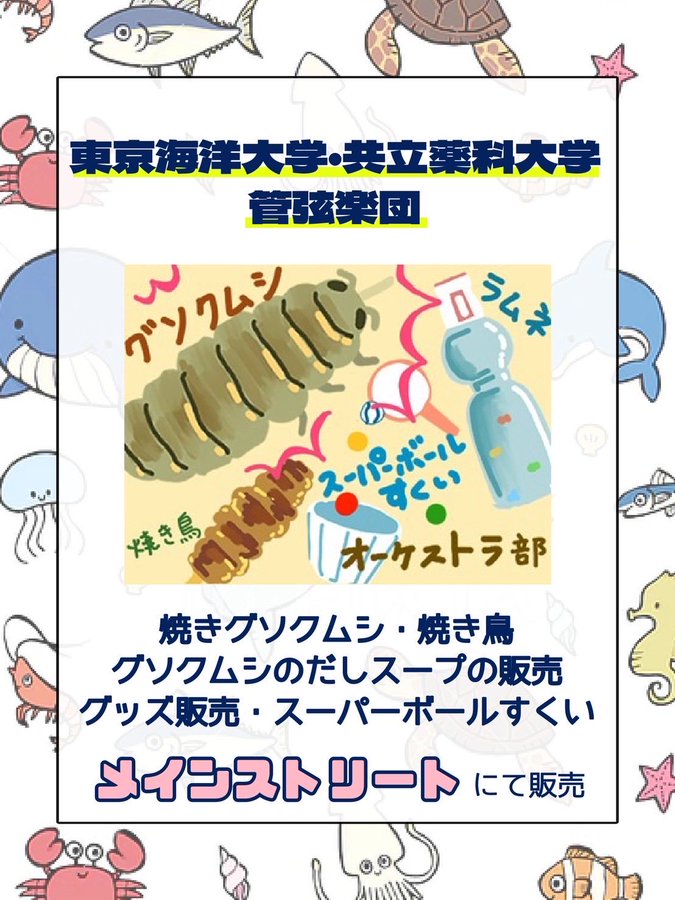 【出展団体紹介8】 「東京海洋大学・共立薬科大学 管弦楽団】 焼きグソクムシ・焼き鳥 グソクムシの出汁スープの食販 グッズ販売 スーパーボールすくいをおこないます! 場所はメインストリートです 海洋大らしい「グソクムシ料理」をぜひ 召し上がってみてください! #海鷹際 #海洋大 #tumsat