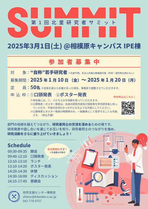 3月1日(土)9:30から、相模原キャンパスで、「第1回北里研究者サミット」(研究支援センター主催)が開催されます。https://kitasato.cypochi.com/jp/research_p..