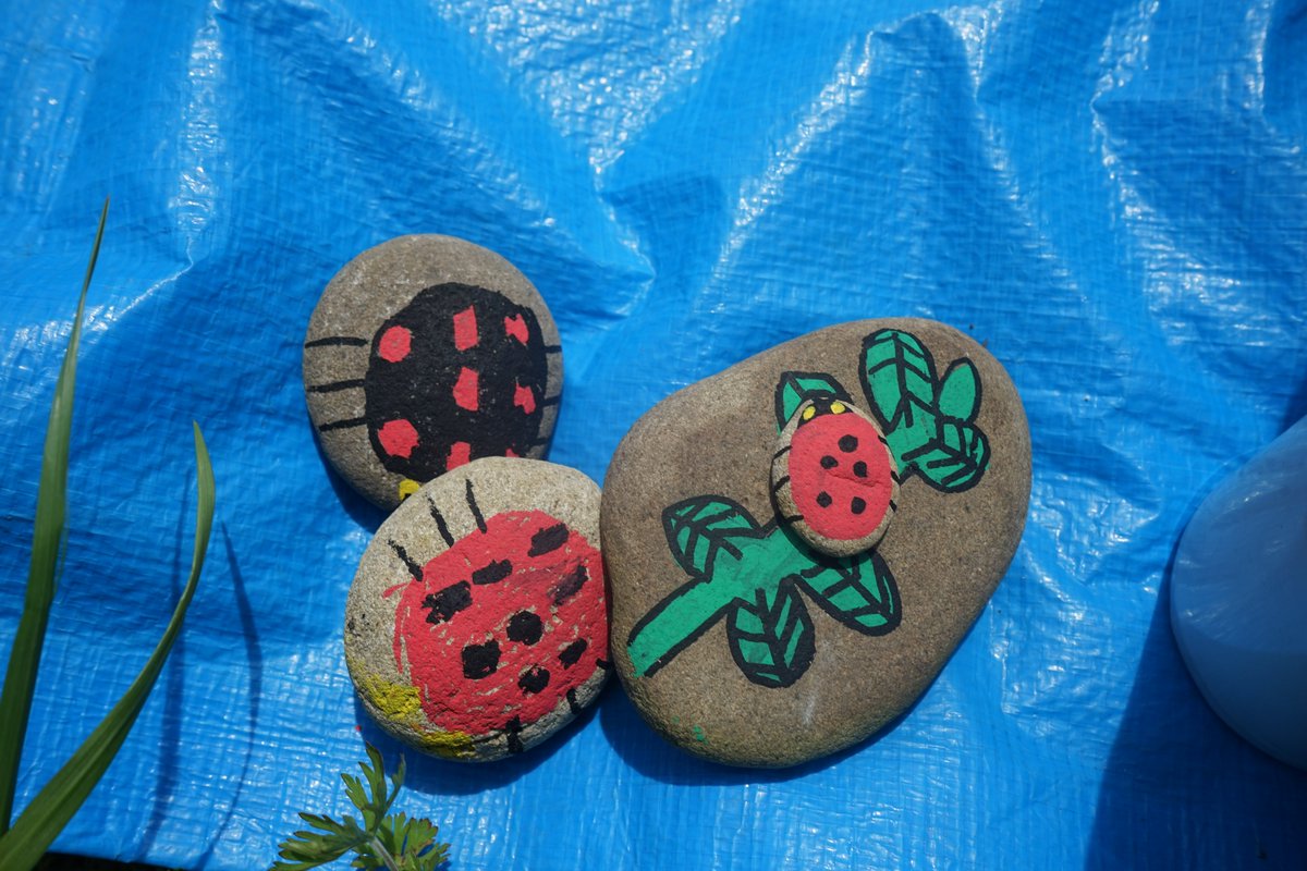 先生と一緒に野原を散策し、昆虫や植物、鳥や石などを観察したり、拾った石に絵を描いたり…