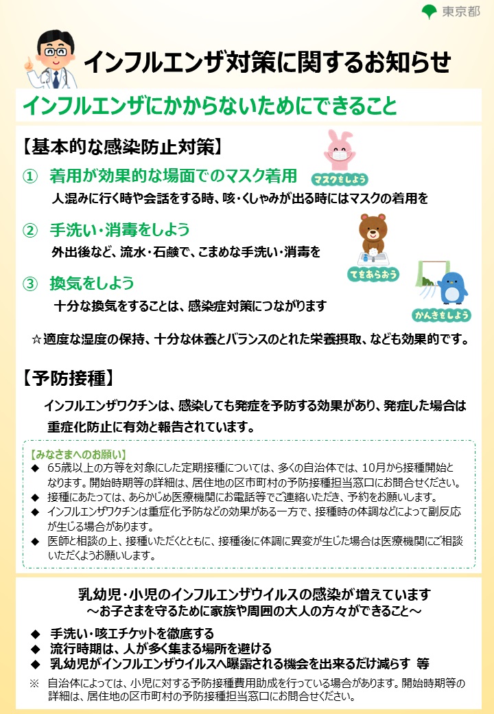 【【流行注意報】インフルエンザが流行しています】 都内の定点当たり報告数は、第43週(10/20~10/26)に10.37となり注意報基準(10.0)を超えました。手洗い・マスク着用・ワクチン接種など、感染防止対策の徹底をお願いします。 #練馬区 https://city.nerima.tokyo.jp/hokenfukushi/hoken/kansensho/seasonal_influenza.html…
