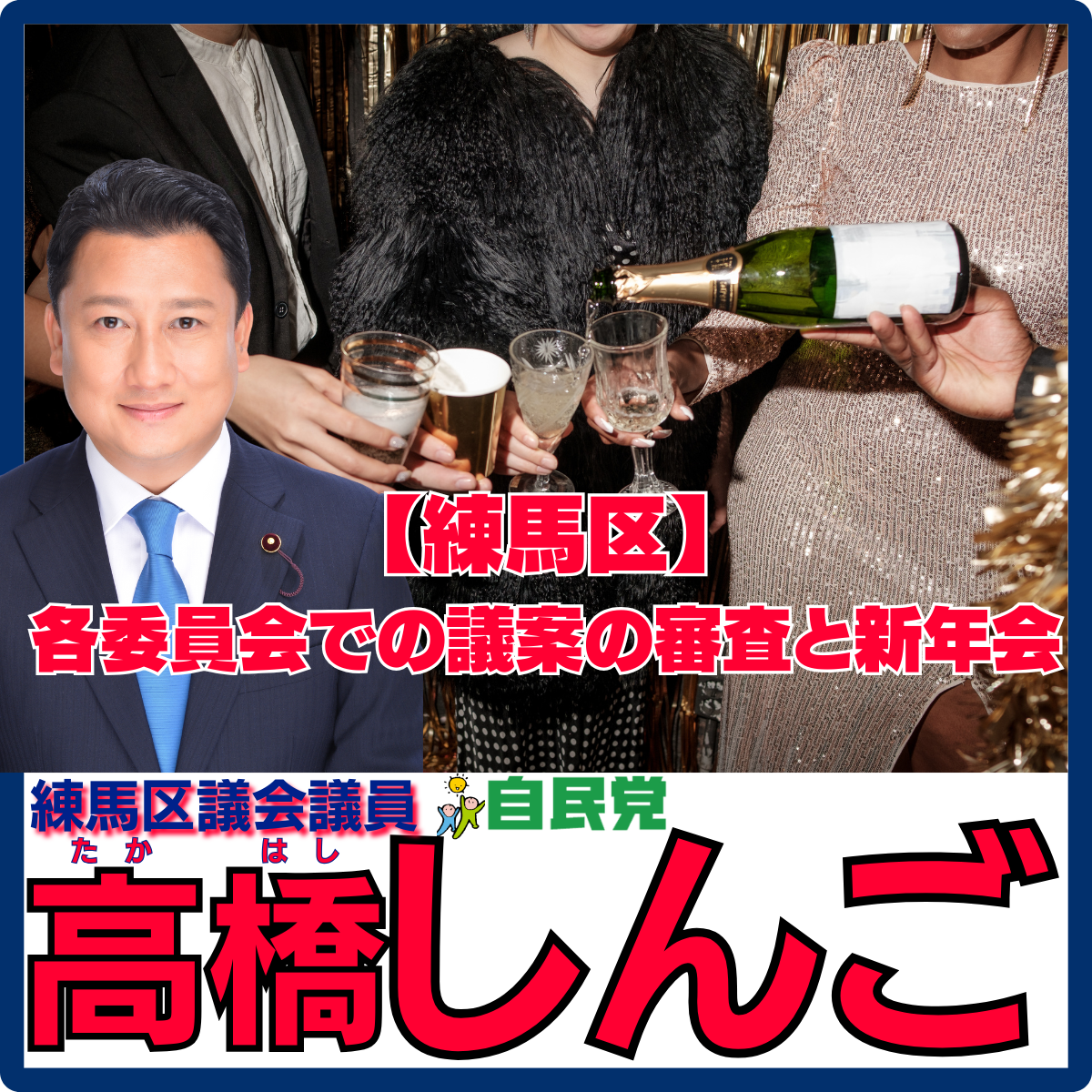 こんにちは、練馬区議会議員高橋しんごです。 今日は各委員会では議案の審査が行われました。そのような中で、もう新年会のご案内を頂き、「今年も本当にあっという間だったな」としみじみ感じています。忘年会の予..