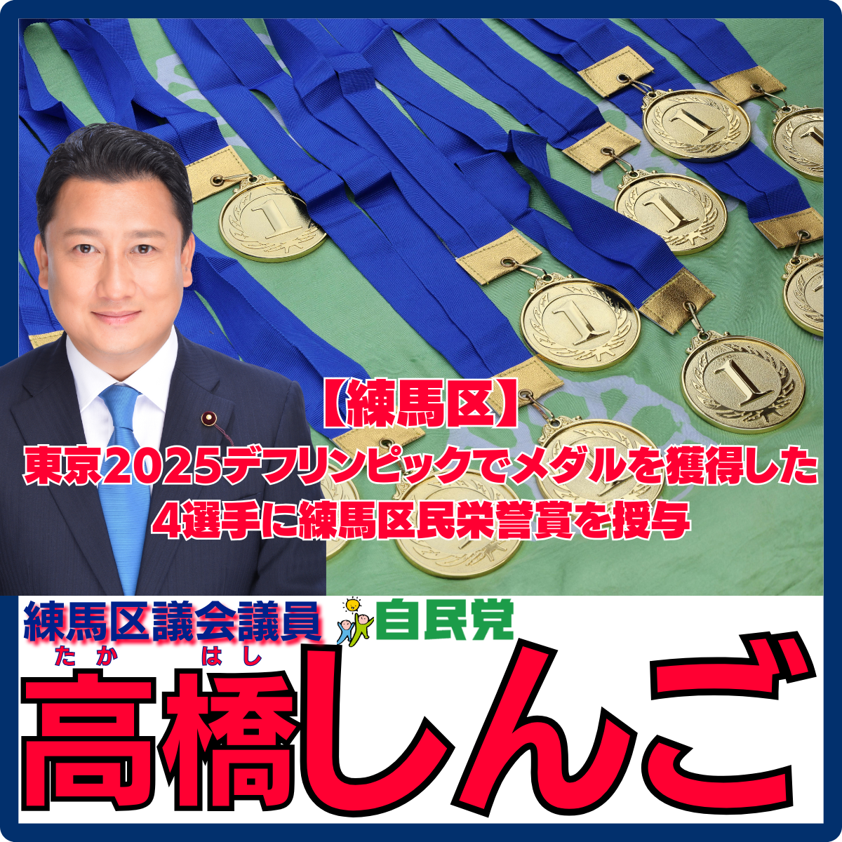 こんにちは、練馬区議会議員高橋しんごです。 東京2025デフリンピックでメダルを獲得した4選手に練馬区民栄誉賞を授与区では、スポーツ、芸術および学術等の分野において、特に顕著な業績を挙げ、広く区民に敬..