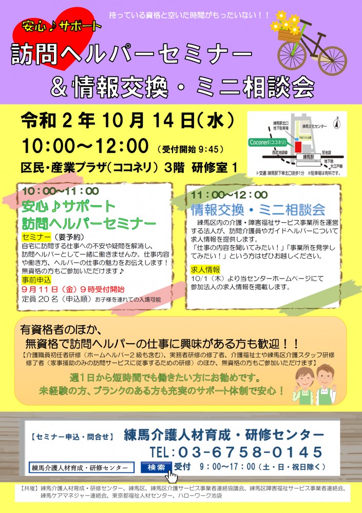 練馬区や各団体などの共催イベント! 10/14(水)10:00~12:00 @区民産業プラザ3階(練馬駅徒歩1分) 練馬区で訪問ヘルパーに興味がある方向けセミナー! *資格・経験は問いません。