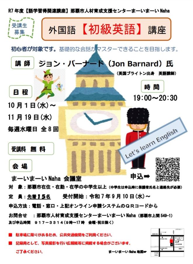 【受講生募集中】【語学習得関連講座】外国語【初級英語】講座日時:10月1日(水)〜11月19日(水)毎週水曜日全8回19時〜20時30分場所:まーいまーいNaha会議室初心者の方対象の講座です。基礎的..