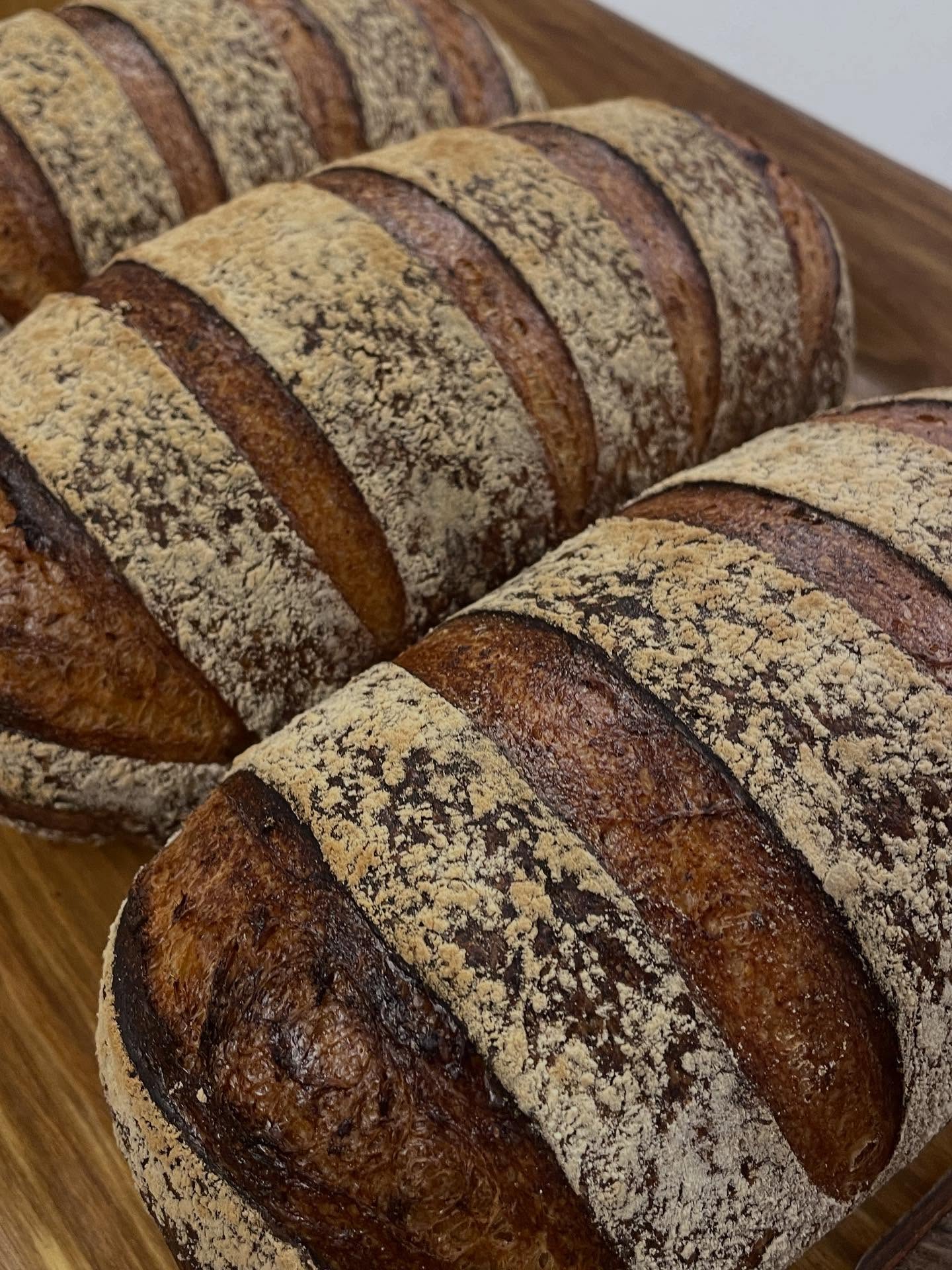 本日定休日、休み明け木曜日から営業です(^^)よろしくお願いします✨写真は【パン・オ・ルヴァン】当店人気ナンバーワンの商品ですパリパリの皮、中はモチモチで少し塩味のきいたライ麦パンです当店では朝に出し..