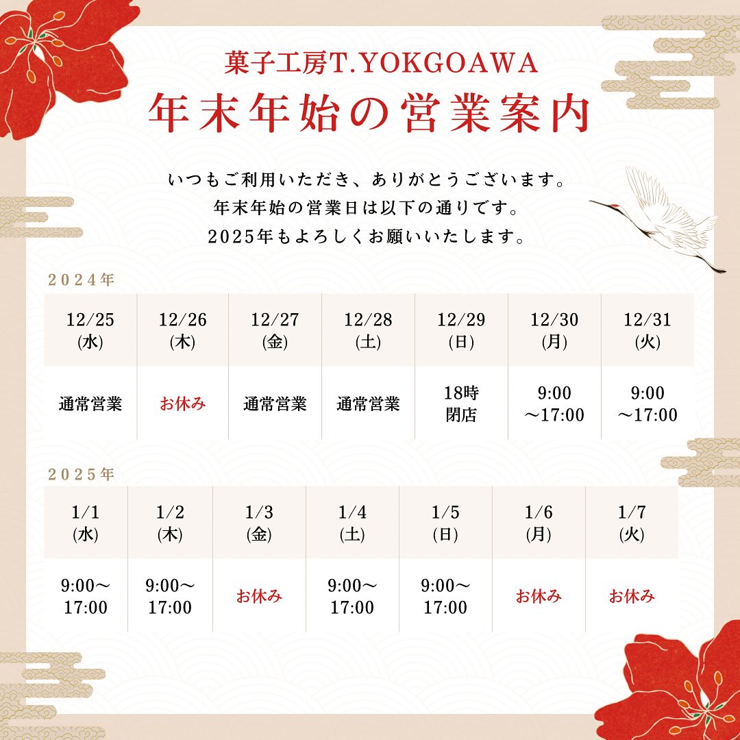 【年末年始の営業日のおしらせ】こんにちは!菓子工房ティ・ヨコガワです🧑🏻🍳 和泉中央本店、岸和田店ともに年末年始は休みなく営業します。12月30日〜1月2日は短縮営業で、17時までの営業です。3(..