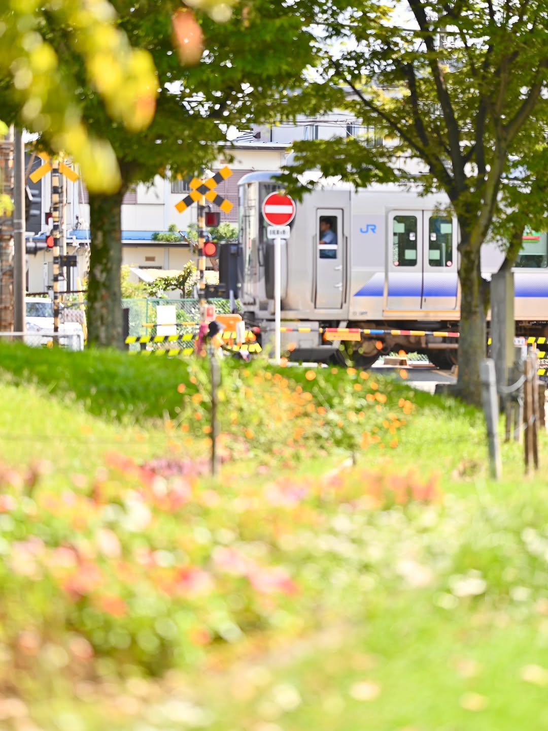 【お気に入りの踏切と花壇♪】お散歩☺️堺市の大仙公園に行ってきました阪和線の見えるそして可愛らしい花壇のあるこの踏切の場所がお気に入りです😊大阪もやっと秋らしくなって来ましたネ「これくらいがちょうどえ..