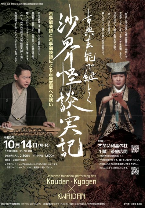 令和6年度堺市文化芸術活動応援補助金の採択事業のご紹介今回は「古典芸能で紐とく沙界怪談実記」です【日時】10月14日(月・祝)13:30開演(13:00開場)【場所】さかい利晶の杜1階茶室広間【参加費..