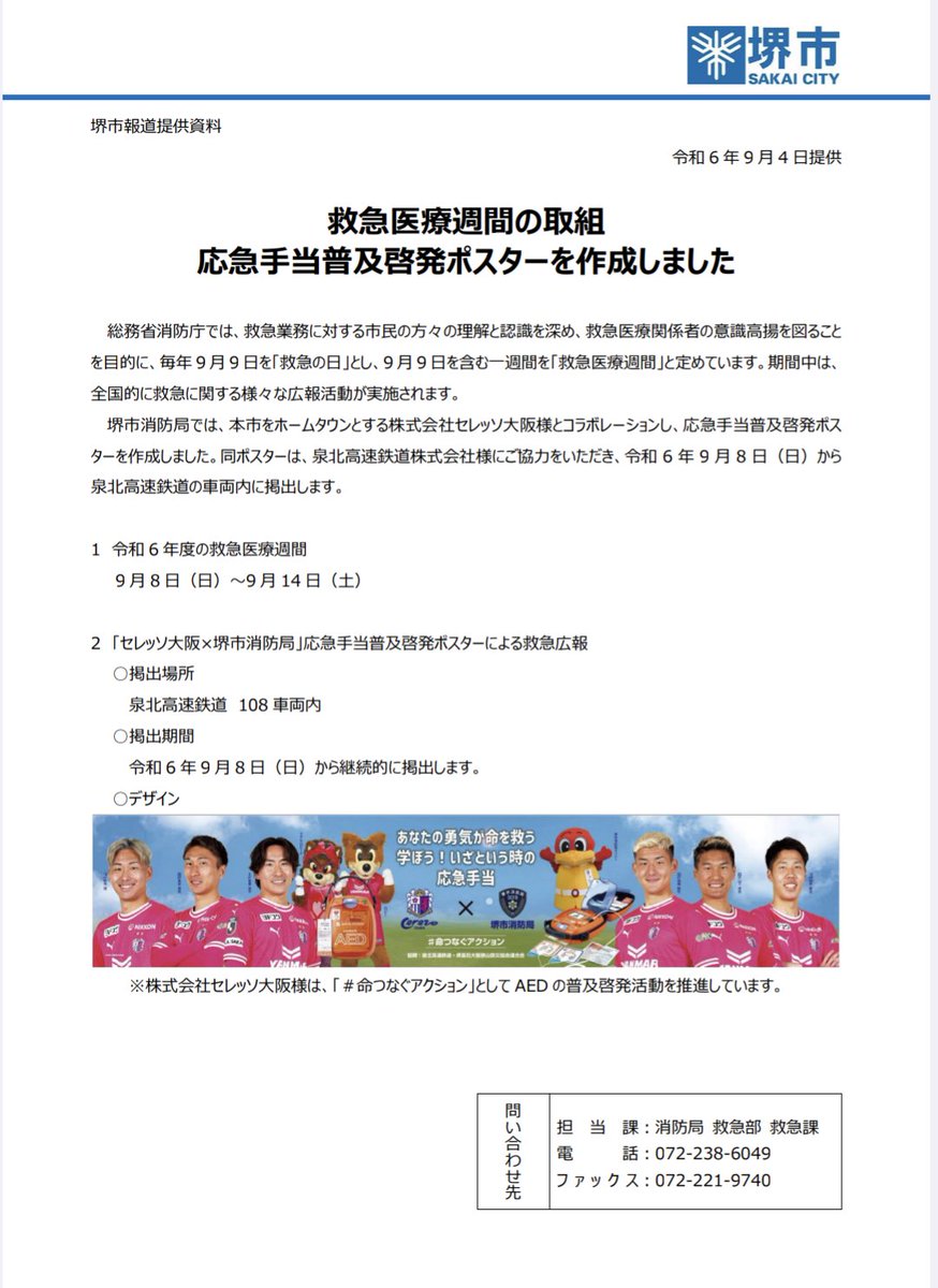 救急医療週間の取組として#セレッソ大阪とコラボしたポスターが#泉北高速鉄道の車両内に掲出されます!お乗りの際はぜひチェックしてみてください!#堺市消防局◆報道提供ホームページはこちらhttps://c..