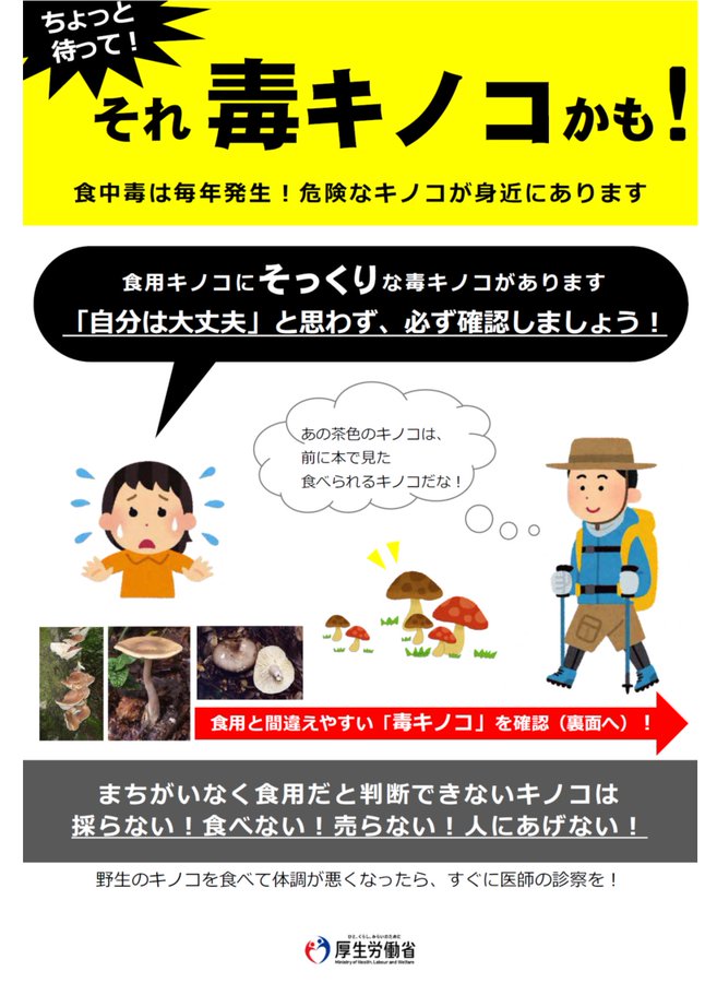 夏の終わりから秋にかけて、#毒キノコを食用キノコと誤って食べたことによる#食中毒が毎年発生しているよ。食用と確実に判断できないキノコは、絶対に採らない!食べない!売らない!人にあげない!ようにして欲し..