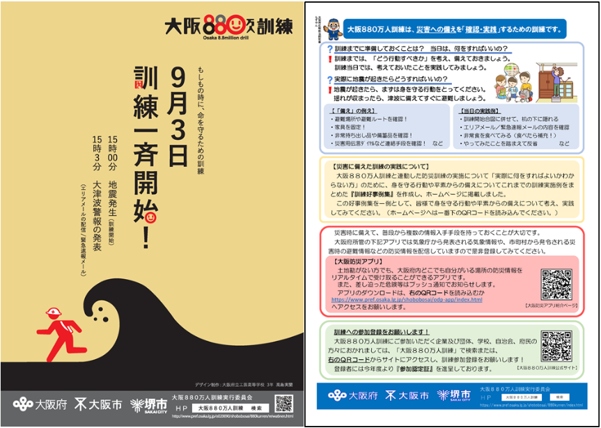 明日、9月3日(火)は大阪880万人訓練の実施日です。15時03分頃と15時05分頃に大阪府と豊中市から緊急速報メールを配信します。また、15時30分頃に防災サイレンを鳴らし、防災スピーカーで案内放送..