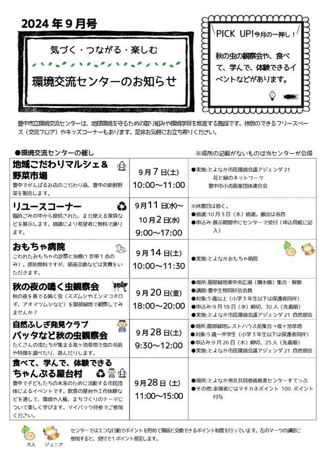 /豊中市立環境交流センターです!\<9月のお知らせ>をご覧ください今月もイベント盛りだくさんです!ぜひご覧ください詳しい内容につきましては、HP<http://kankyokoryu.jp>をご覧くだ..