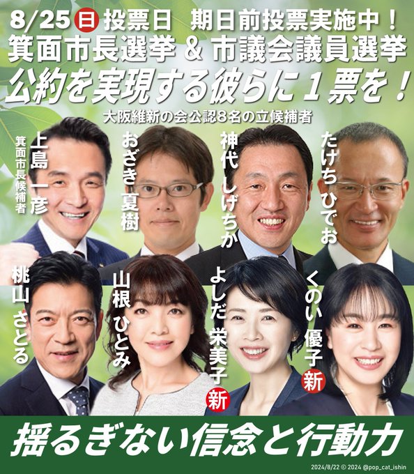 明日は箕面市議会議員選挙の投票日!大阪維新の会公認候補#たけちひでお#神代しげちか#おざき夏樹#桃山さとる#山根ひとみ#よしだ栄美子#くのい優子をよろしくお願いします。市長だけではなく市議会の議席確保..
