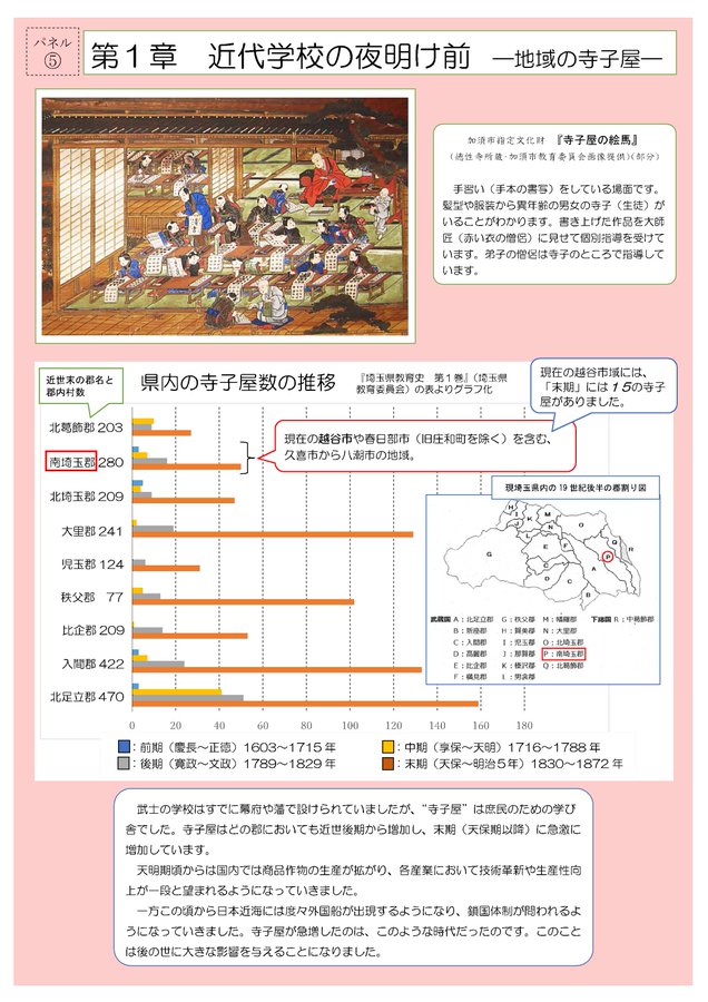 越谷市教育委員会では、今夏、市域の近代教育150年を振り返る企画展「越谷から見た近代教育150年」を開催しました。この企画展の展示パネルと配付資料のPDFデータを、越谷市デジタルアーカイブで公開しまし..