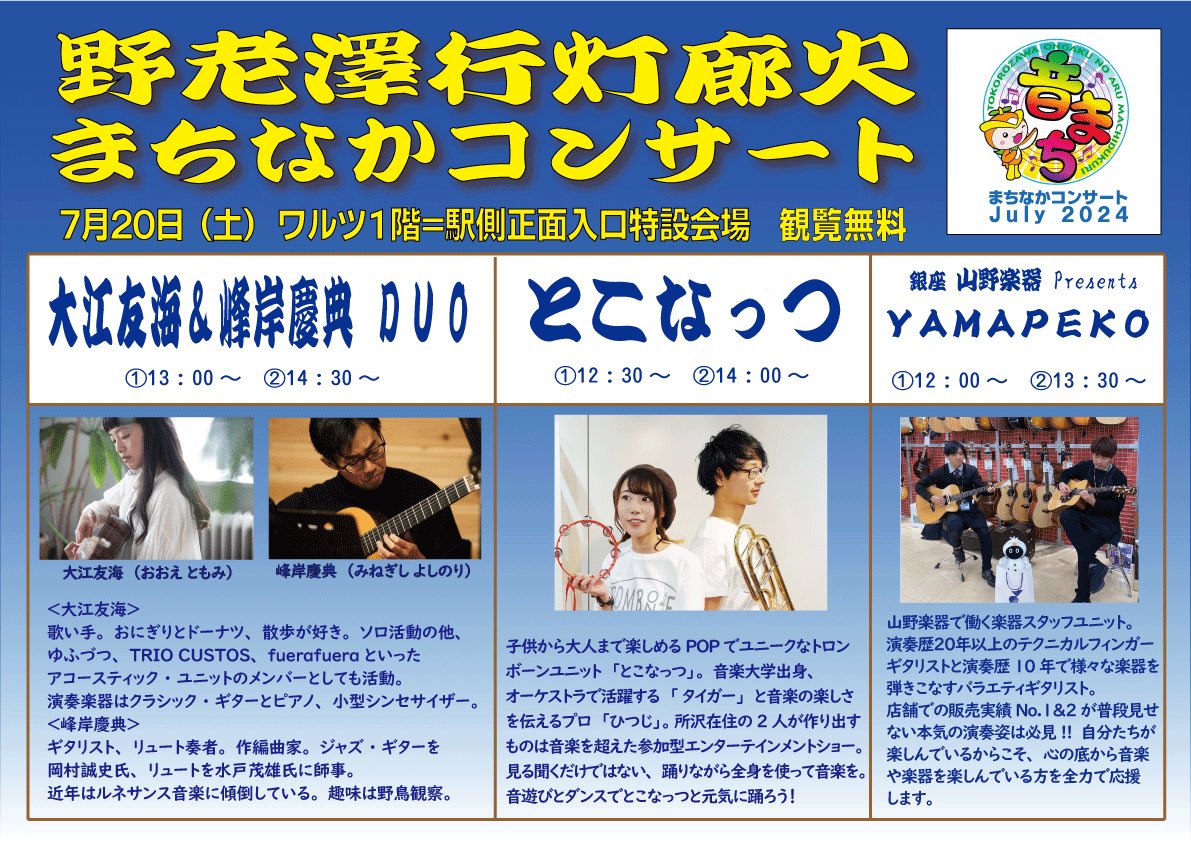 まちなかコンサートJuly2024を開催します!(#野老澤行灯廊火まちなかコンサート)まちなかコンサートは所沢市内のまちなかで開催する無料コンサートです。68回目となる今回はワルツ所沢で開催し、#大江..