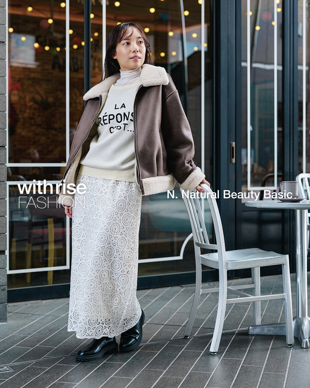 2025WinterFASHIONwithrise.自分らしく着こなす、二子玉川ライズS.C.の最旬ファッション!メンズライクなムートンジャケットには、ロゴ入りのニットと女性らしい印象のレーススカート..