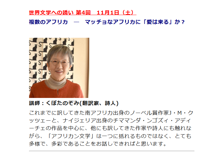 【30祭連続講座「世界文学への誘い~愛について~」】第4回の講師は翻訳家で詩人のくぼたのぞみさん。テーマは「複数のアフリカ-マッチョなアフリカに「愛は来る」か?」。11/1(土)14:00~参加費50..