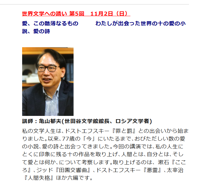 【30祭連続講座「世界文学への誘い~愛について~」】第5回・最終回の講師は世田谷文学館館長・亀山郁夫。テーマは「愛、この酷薄なるものわたしが出会った世界の十の愛の小説、愛の詩」。11/2(日)14:0..