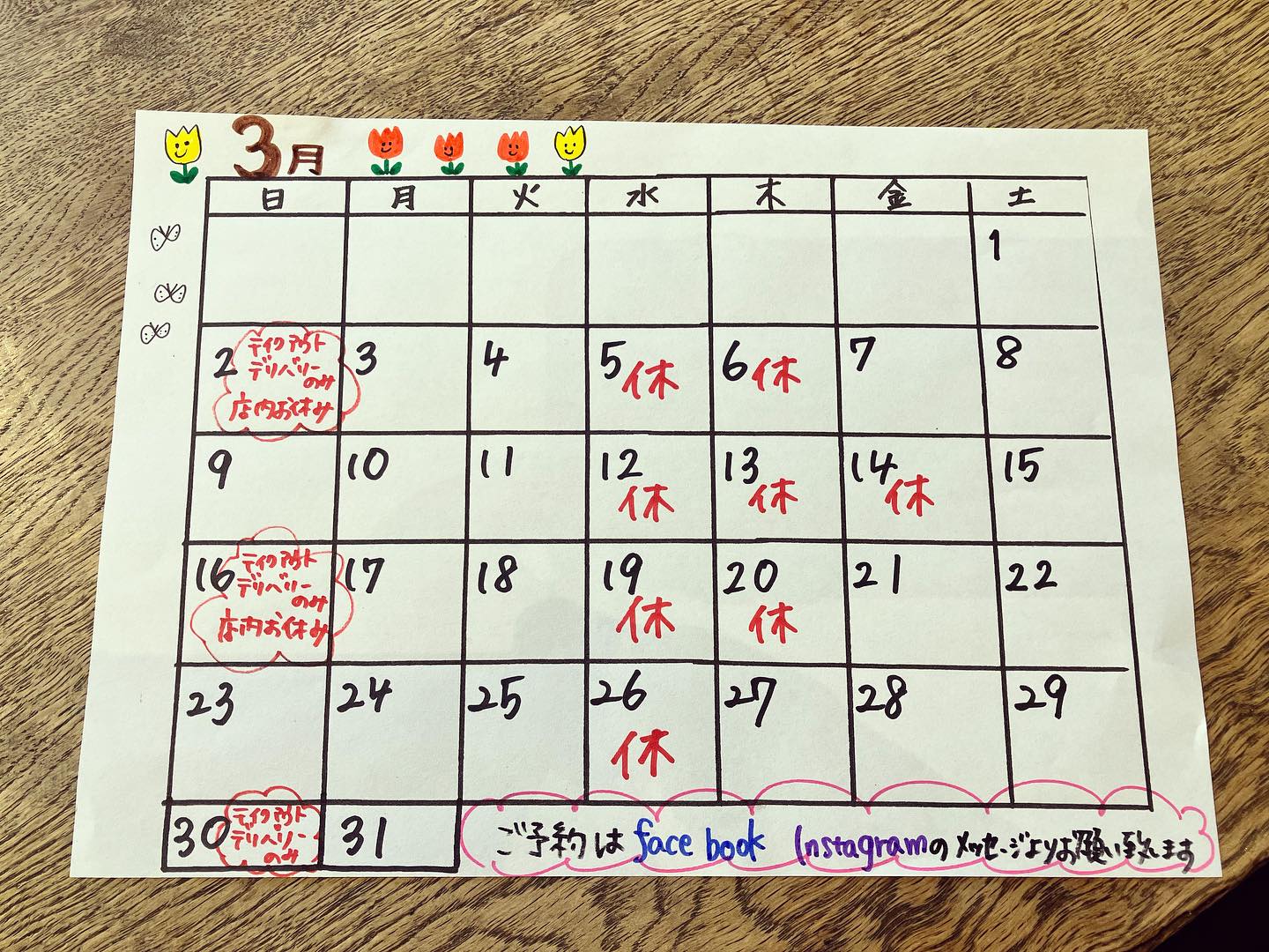 3月の営業予定です。遅くなりました3月の営業予定です。水曜日以外のお休みが何日かあります。ご注意くだ..