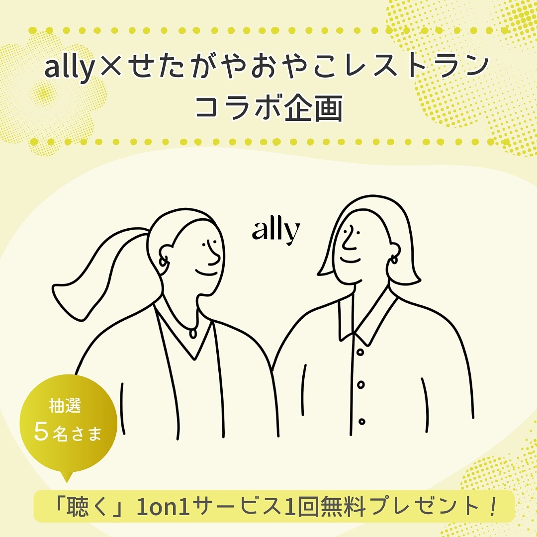 🌼【ally✖️せたがやおやこレストランコラボ企画】今回、私の友人のサービス【ally】とのコラボが実現しました‼️“ママのための「聴く」1on1サービス”allyよりプレゼント🎁✨頑張るママの心をサ..