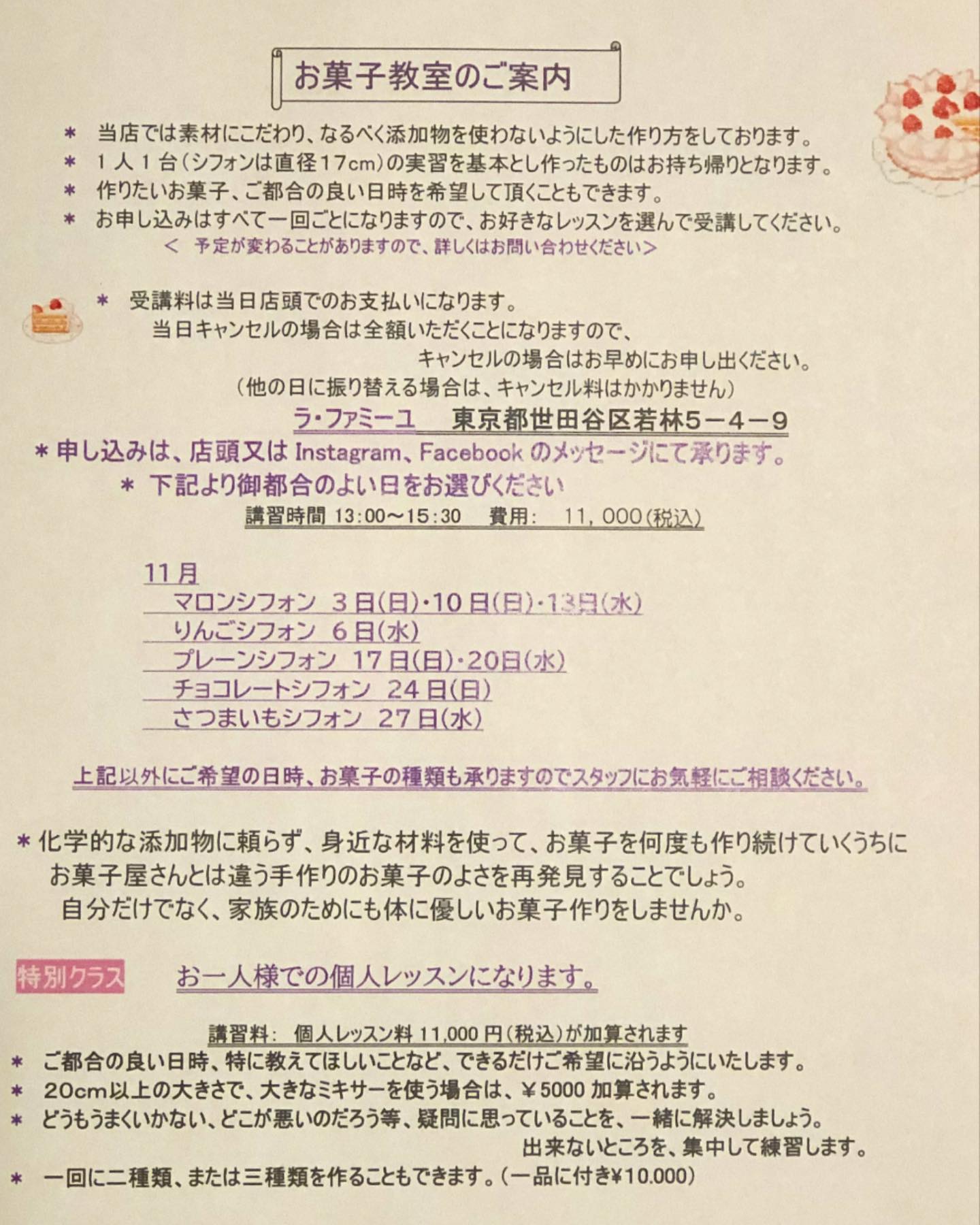 11月お菓子教室以前アップした予定に訂正箇所がありますのでご確認くださいマロンシフォン3(日)・10(日)..