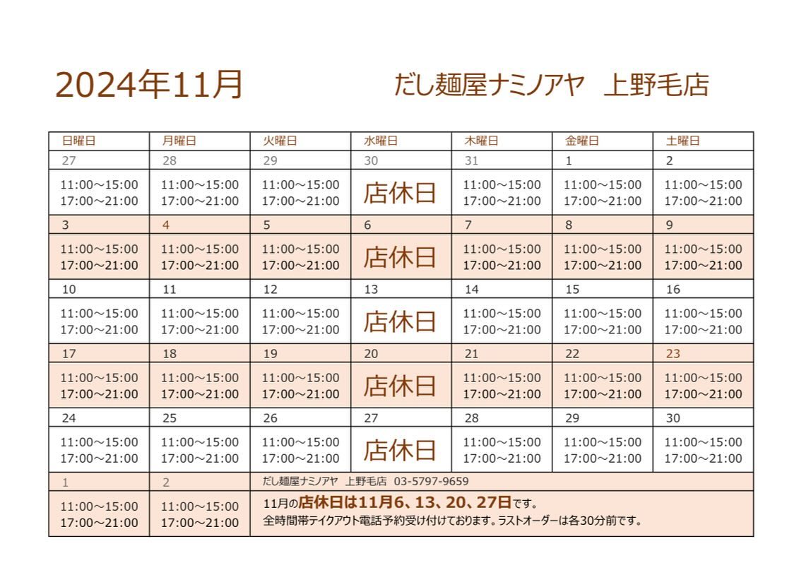 皆さんおはようございます😄2024年11月上野毛本店スケジュールです🗓※毎週水曜が定休日となります🙇🏻♂️🙇🏻♂️テイクアウト予約は10時から受け付けております!(受取はオープンの11時からとなり..