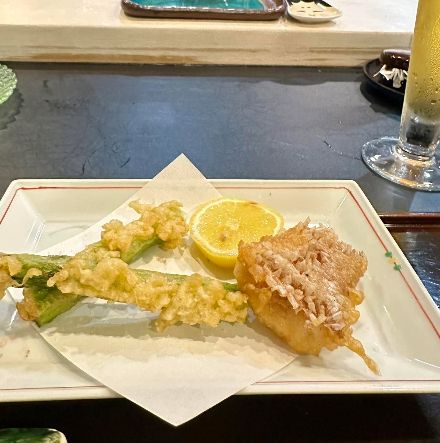 暑い日が続きますね。ちょっと軽めのものが食べたくなる頃です。青アスパラと甘鯛の天ぷらは、ふんわりとした身に、サクッとした衣がよく合います🍃シャキッとしたアスパラの食感もいいアクセント。季節の素材を、軽..