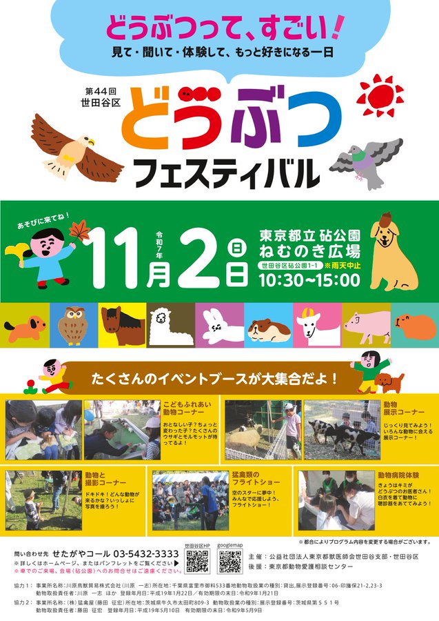 11/2(日)は「第44回世田谷区どうぶつフェスティバル」です。かわいい動物達と触れ合えます。場所:東京都立砧公園(世田谷区砧公園1-1)開催時間10:30~15:00#世田谷#外あそび#どうぶつht..