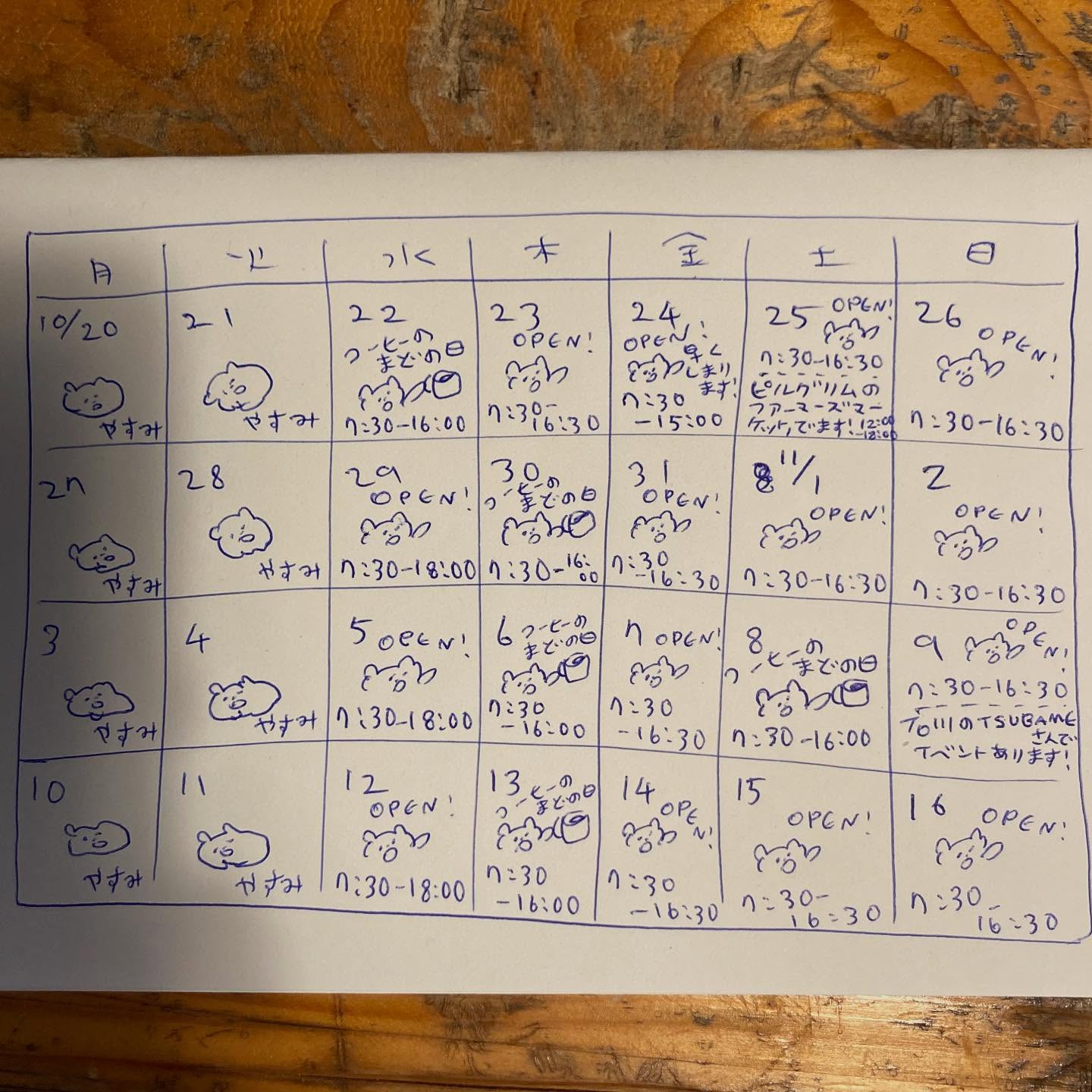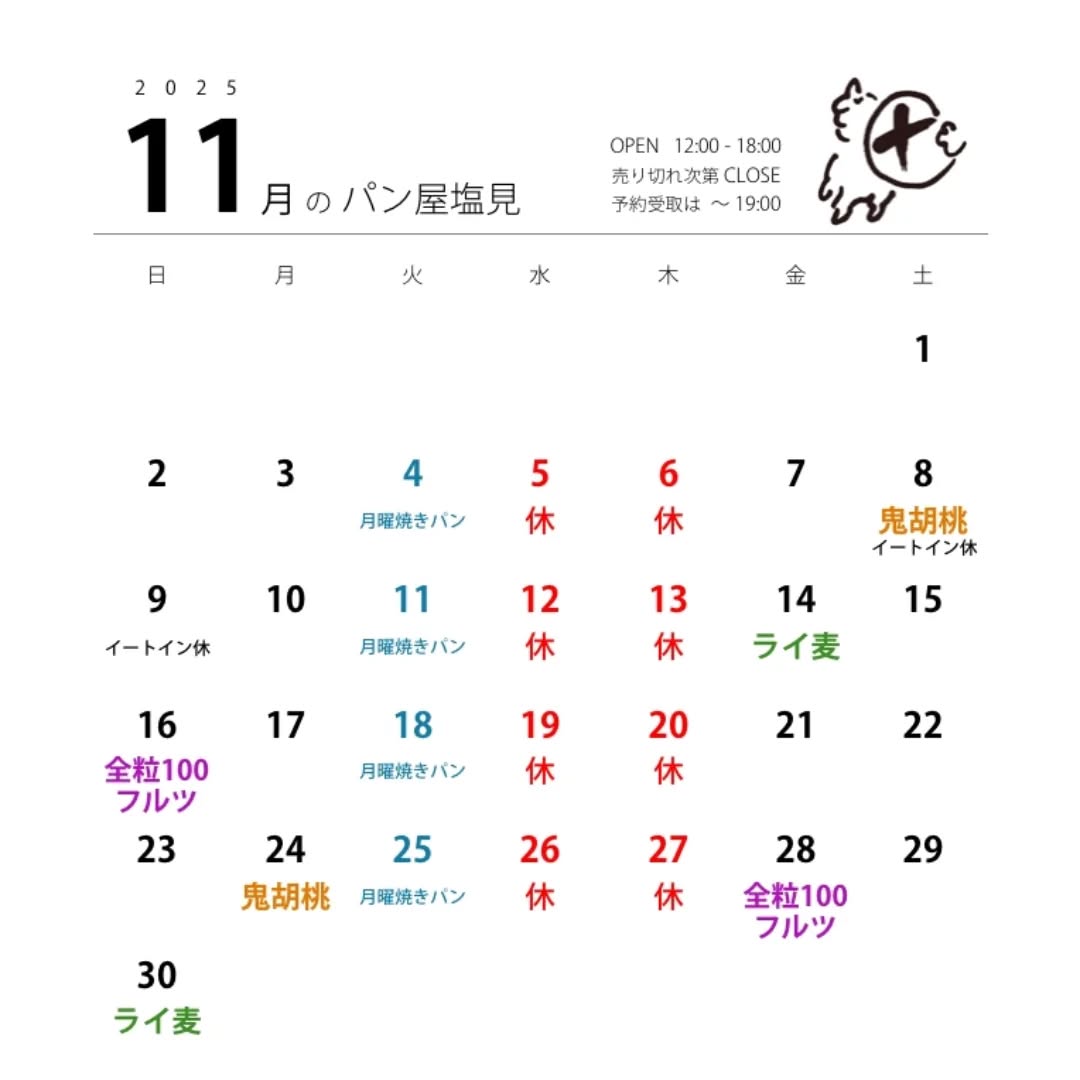 11月のカレンダーです。8(土)・24(月)は鬼胡桃カンパーニュ、14(金)・30(日)はライ麦入りカンパーニュをお出しします。新しい試みとして、これから月替わりでいろいろな麦の全粒粉100%パンを焼..