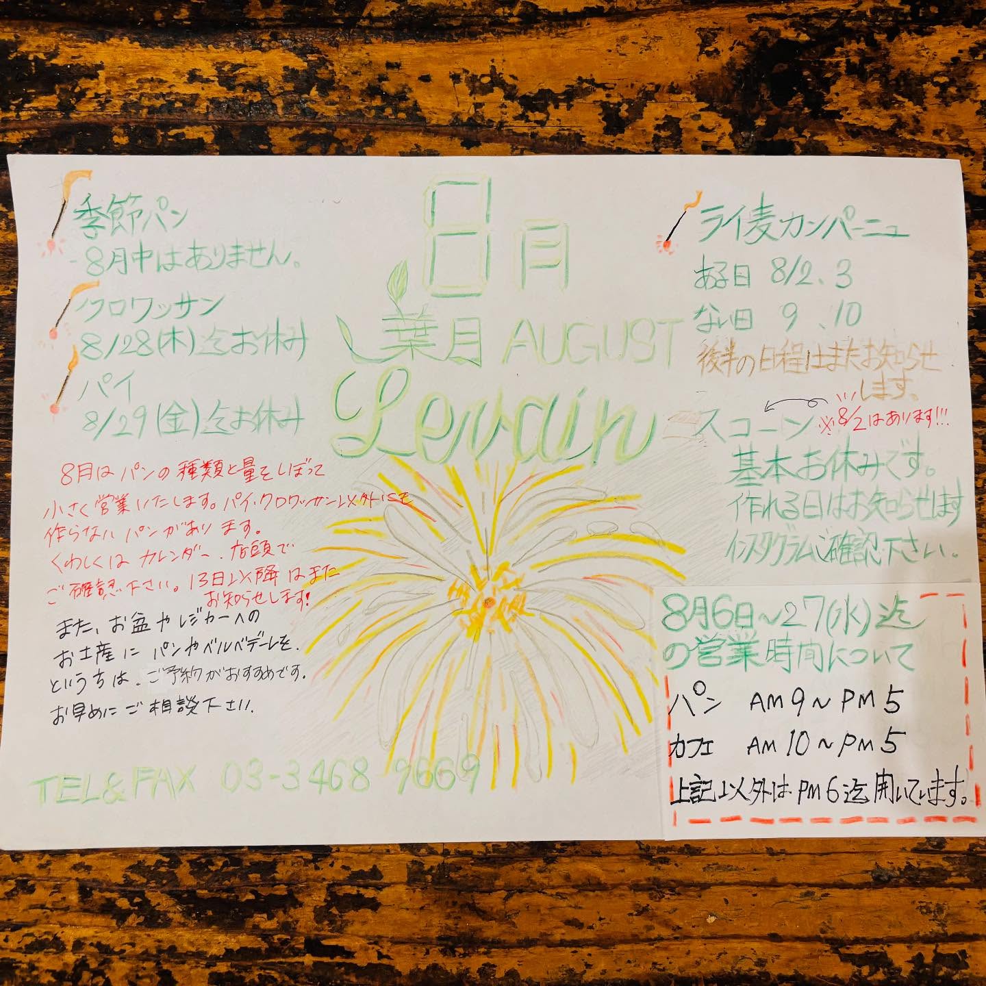 【8月のお知らせ】こんばんは🌇 ルヴァン富ヶ谷です。8月になりました。お知らせは上記の通りです。後半未定な事ございますのでまたお知らせ致します。8月6日〜27日までがパン 9時から17時カフェ10時か..