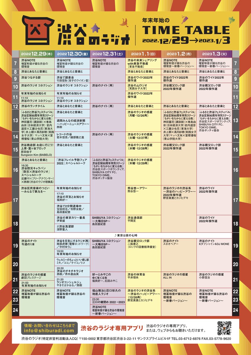 12月29日から1月3日まで、渋谷のラジオは特別編成でお送りします!どうぞおたのしみに📻✨#渋谷のラジオ渋谷のラジオ@shibuyanoradio【2022-2023年末年始タイムテーブル】12/29..