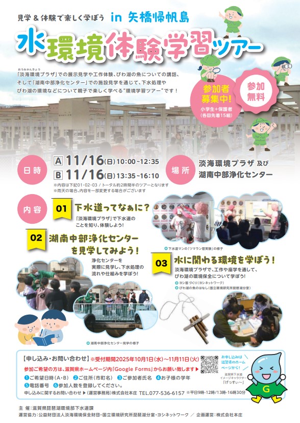 親子で学ぶ水環境学習ツアー開催下水処理やびわ湖の生き物等について楽しく学べるwo!参加費は無料だwo(*^_^*)みなさまのご参加をお待ちしてるwo▼詳しくはこちらhttps://pref.shiga..