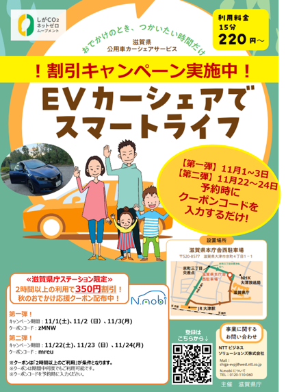 公用車EVカーシェアリングを秋のレジャーにたくさんご利用いただくため、秋のおでかけ応援キャンペーンがスタート11月の3連休、クーポンコードの入力でカーシェアが350円割引で使えるwo!この機に、環境に..