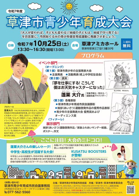\令和7年度草津市青少年育成大会/各種メディアで大活躍の気象予報士蓬莱大介さんの講演や市内中学・高校生の代表による青少年の主張意見作文を発表するイベントですとき10/25(土)13:30~ところ草津ア..