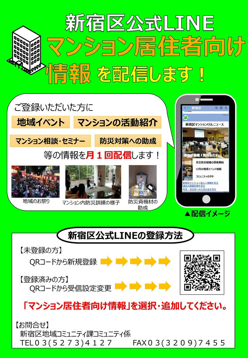 【区公式LINEでマンション居住者向け情報を配信しています】月1回「地域イベント」「マンションの活動紹介」「マンション防災・相談」等の情報を配信。受信希望の方は区公式LINEの受信設定から「マンション..