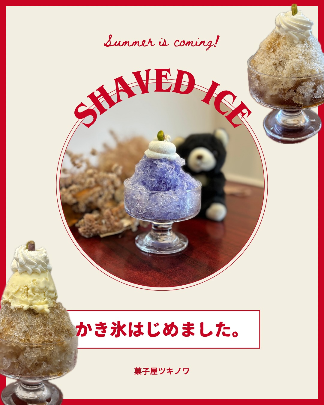 こんにちは!菓子屋ツキノワです。遅ればせながら、ミニかき氷始めました!🍧イートイン限定で、・自家製..