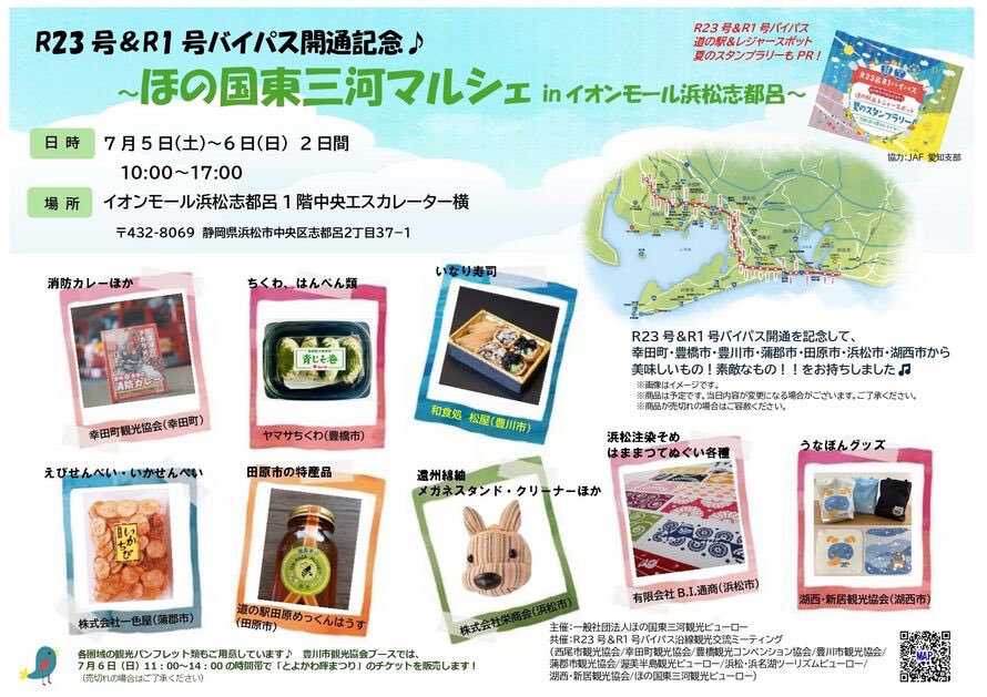 7/5(土)・7/6(日)開催R23号&R1号バイパス開通記念【ほの国東三河マルシェin浜松志都呂】浜松に東三河のおいしいものが大集合#浜松注染染めや#遠州綿紬、湖西市キャラクター#うなぽんグッズもあ..