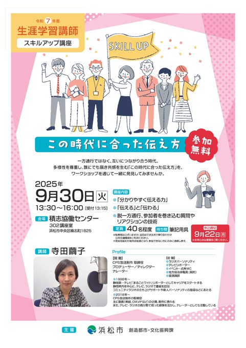 ☆生涯学習講師スキルアップ講座☆テーマ:「この時代に合った伝え方」講師:寺田繭子さんどなたでも参加可能!分かりやすく伝える力や参加者を巻き込む技術を学びます。日時:9/30(火)13:30~16:00..