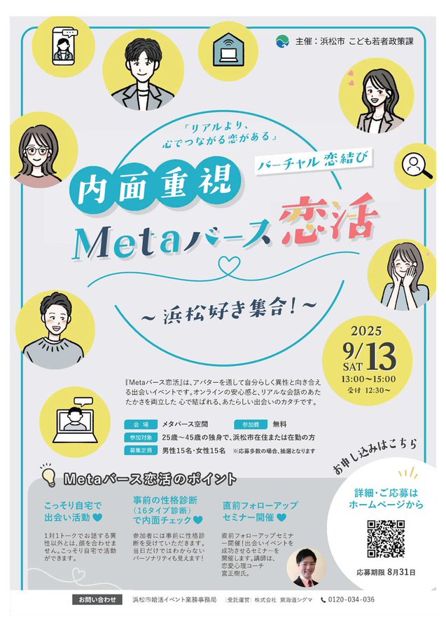 【#婚活イベント「Metaバース恋活~浜松好き集合!~」】インターネット上の仮想空間(メタバース空間)で実施するため、内面を重視した出会いが期待できます。事前の性格診断も行うので、ぴったりのお相手が見..