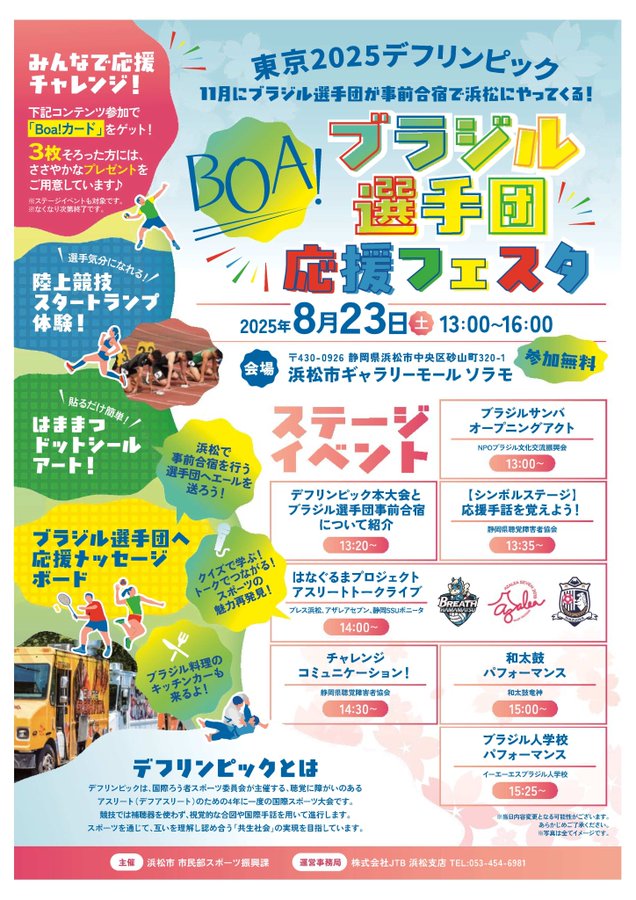 #東京2025デフリンピック開催に合わせ、11月にブラジル選手団が#浜松市で事前合宿を行います。事前合宿に向け「BOA!ブラジル選手団応援フェスタ」を開催誰もが気軽に参加できるイベントですので、ぜひお..