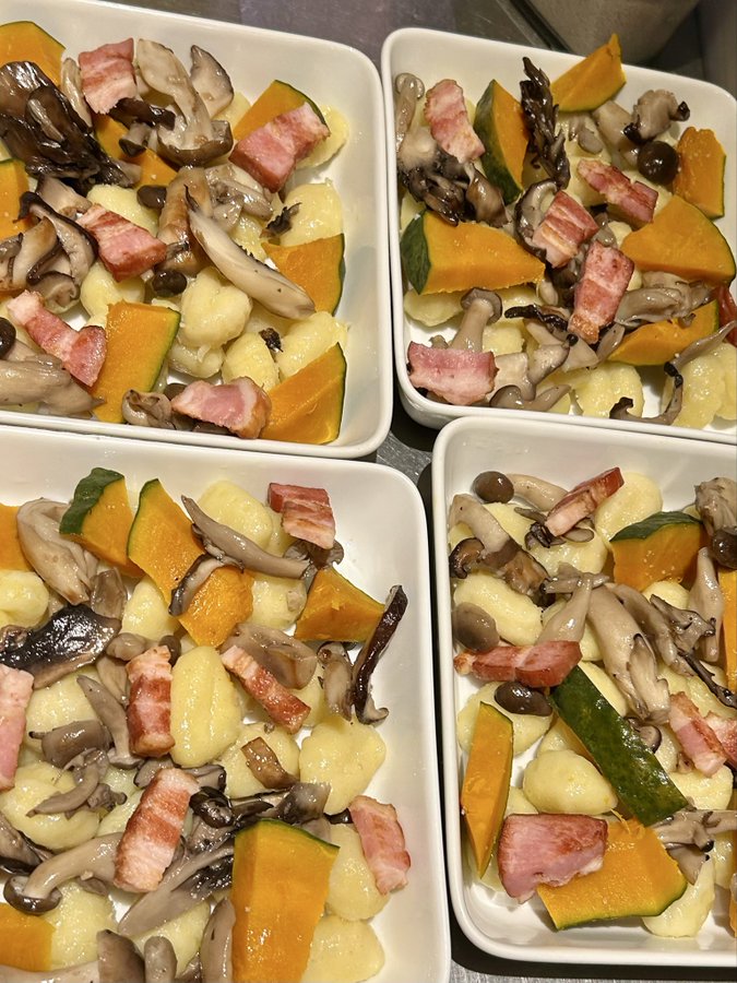 10/18(土)ニョッキグラタン仕込み中。秋ですね……夜のオススメは、南瓜ときのことブロックベーコンの味噌クリームニョッキグラタン、国産牛のタリアータ、里芋と春菊と干し海老の揚げ春巻きetc…テイクア..