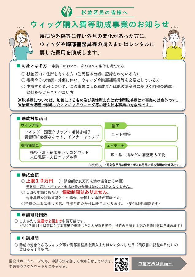 /#ウイッグ購入費等助成事業の拡充について\#がん患者に限定していた#ウイッグ購入費等助成事業の対象者や上限額などの助成内容を拡充します詳細、申請方法などはこちらhttps://city.sugina..