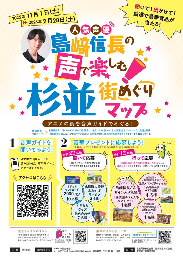 ╋━━杉並のまちを人気声優の声で紹介━━╋#声優の#島﨑信長さんが区の観光スポットを案内する音声ガイドを作成しました現地でしか聞くことができない音声や豪華賞品が当たるスタンプラリーも楽しめますR8.2..