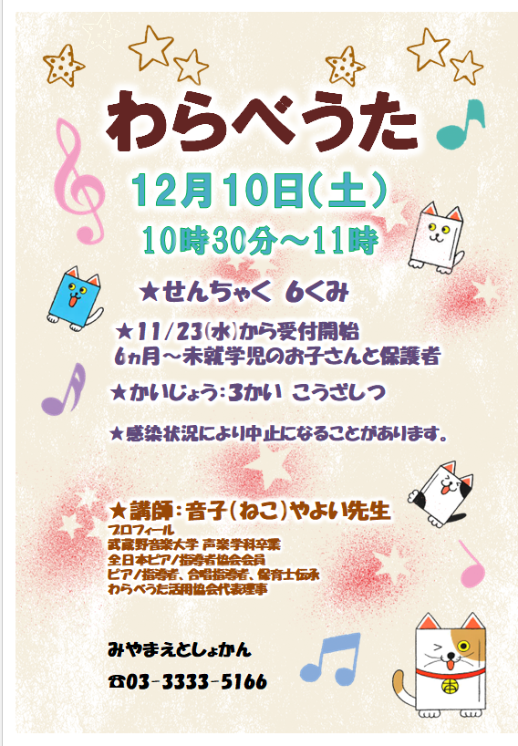 【図書館】おはようございます。11/25(金)は夜8時までの開館です。12月10日(土)に「親子であそぼう!わらべうた」を行います。昔懐かしい「わらべうた」を絵本と一緒にお届けします。ただいまご予約受付中です。ご参加をお待ちしております♪